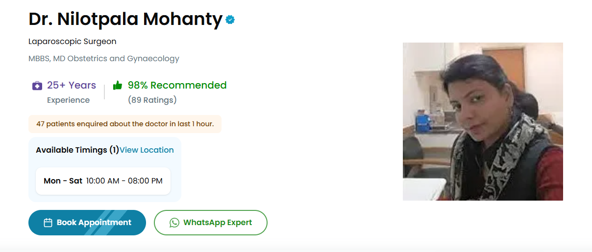 Dr. Nilotpala Mohanty visits Max Superspeciality Hospital and Fortis Hospital in Delhi. Hence, one can take an appointment for the best consultation regarding gynaecology.
